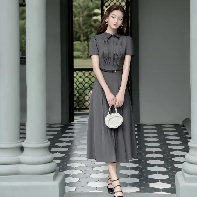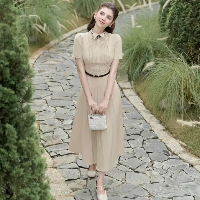 Váy Đầm Nữ Dáng Dài Xòe Xếp Ly Màu Be & Ghi Xám Thanh Lịch Công Sở SOLEIL – Tochie Dress (Kèm Đai Ngẫu Nhiên) VD58