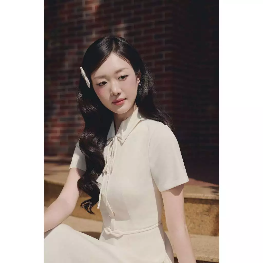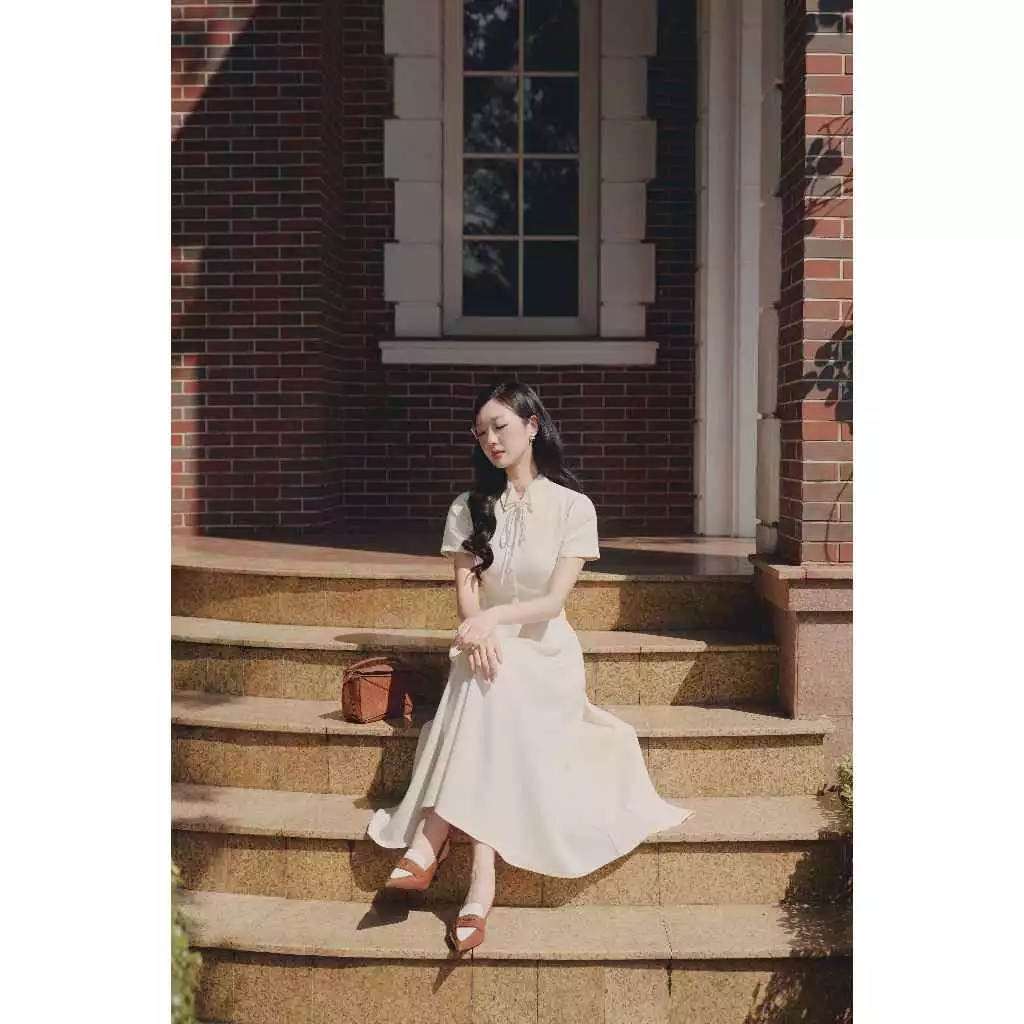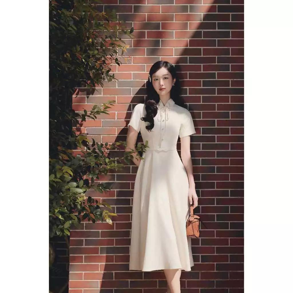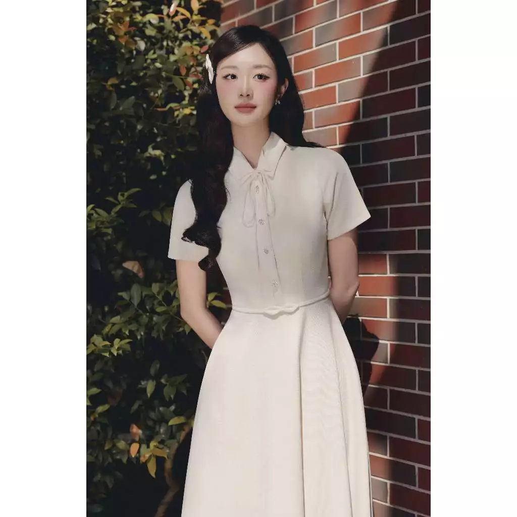Đầm Nữ Dáng Dài, Tay Bồng Cổ Sen Trắng Phối Nơ SOLEIL – Auri Dress VD153